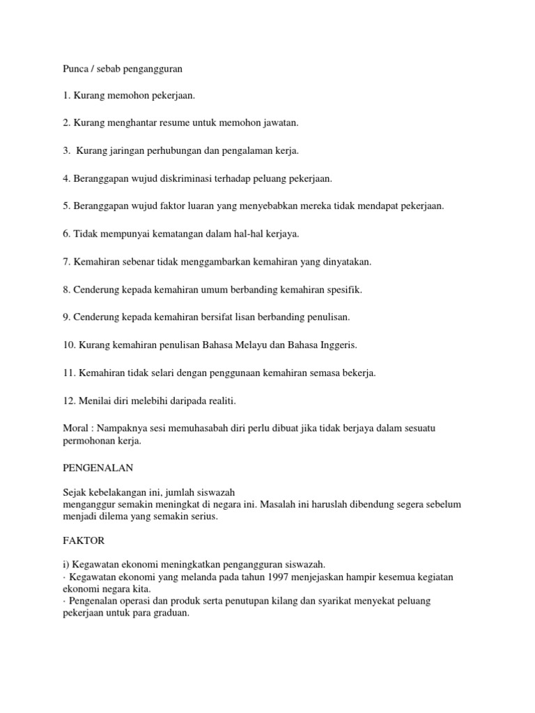 Berikutan daripada ketidak seimbangan itu pemegang ijazah diploma atau sijil mencatatkan peratusan jumlah pengangguran tertinggi dengan 42 berbanding pendidikan menengah yang mencatatkan 34. Terdapat pelbagai faktor yang menyebabkan masalah pengangguran ini berlaku antaranya faktor kegawatan ekonomi yang. Penutup Karangan Langkah mengatasi pengangguran.